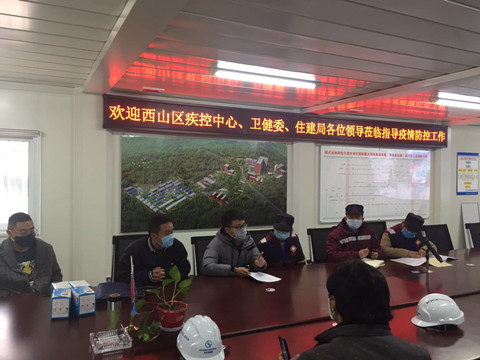 西山區疾控中心、衛健委、住建局領導在詳細察看項目疫情防控方案、防護物資儲備、生產生活區域消毒、員工排查臺賬等情況后,對該項目的防疫工作給予了高度評價并向堅守崗位的建設者表示感謝。三部門領導同時指出,當前疫情防控形勢嚴峻,要堅持疫情防控與復工復產兩手抓,做到嚴格防控、安全生產、緊張有序、標準不降。西山區各級領導會想方設法解決大家的燃眉之急,希望大家積極做好自身防護,配合做好各項防控工作,平安度過疫情,齊心協力打贏疫情防控阻擊戰。